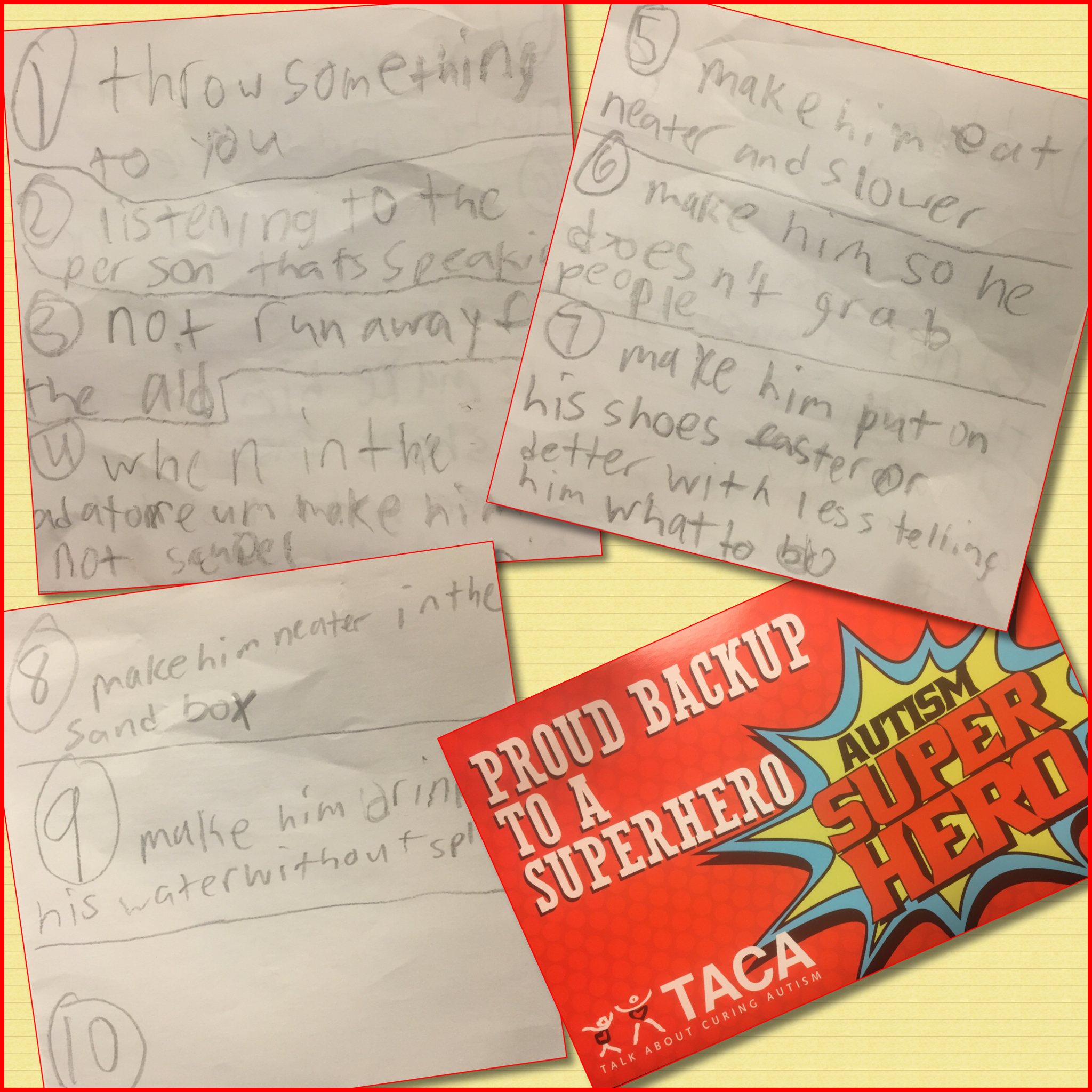 Xander has played such an active role in his brother’s life that much of the advice he gives to my husband and I has proven to be invaluable. As with most families, securing appropriate services through the school district is always a stressful challenge. So this year, as I was pulling together data and progress reports for an upcoming IEP meeting, I decided to ask for help from the expert on Timmy, Xander. I asked him to write down 10 goals he thought the school district should work on with on his brother this year. And of course in 10-year-old fashion, he chose to scrawl them down on little pieces of paper. While pretending that he wasn’t taking it seriously, he wrote down 9 goals and then handed them back to me with pride. I read through them with amazement, as he had completely understood the challenge. So the next day at the IEP meeting I had Xander’s little notes with me. Sometimes I do a family statement. These notes were all the family statement needed this year. The boys go to the same elementary school, so the staff is familiar with Xander and Timmy’s relationship. The teachers and staff have done a great job. They know what Timmy is capable of now and what else is needed to help him be successful in other areas. As we went through the proposed goals, we became aware of how many coincided with Xander’s suggested goals. By the end of the meeting, every single one of Xander’s goals was included in some shape or form into the IEP documents.