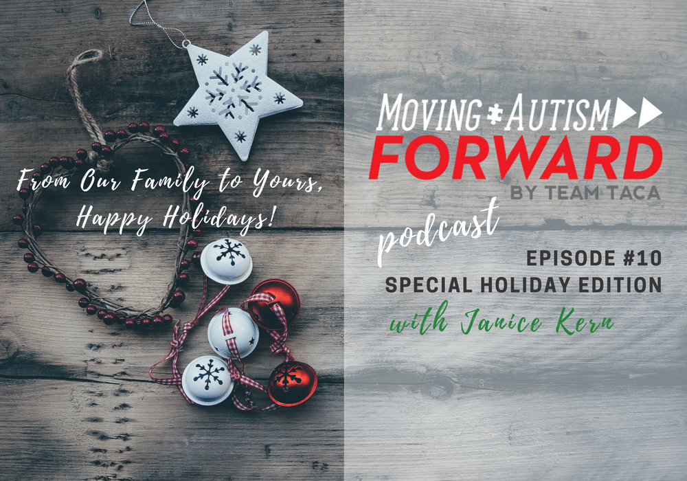 Before we get into the show, the autism journey is a challenge. But our kids are a CELEBRATION. Each year we like to take a little time out of the holiday hustle to celebrate the accomplishments our children with autism have made throughout the year. With autism, there is no small accomplishment and we want to help you celebrate one for your child. Whether it’s been trying a new food, becoming potty trained, speaking their first word or gaining an independent skill…we want to hear it. Please email a photo of your child along with a description of what you are celebrating and your child’s FIRST NAME to holly@tacanow.org. Then watch the TACA National Facebook page starting December 21st to see your child along with many others and celebrate our kids.