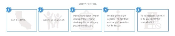 This study is looking to recruit 250 children born in California – 125 with an autism diagnosis, and 125 neurotypical controls. In the initial phase, the study does not need any new samples – they just need your permission to access the NBS data already available on your child from the state of California. They are looking for participants who meet the following criteria: